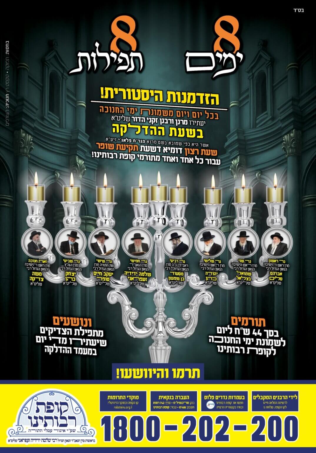 קופת רבותינו בראשות מרן הגאב"ד הגרש"י זעפראני שליט"א, יוצאת עם בשורה חסרת תקדים לציבור יראי ה', לפיה יתקיימו סדרת מעמדי תפילה על ידי מרנן ורבנן זקני הדור שליט"א לאורך ימי החנוכה.